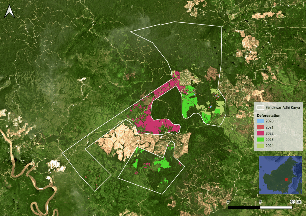 PT. SAKの事業管理地における年次の森林破壊を示した地図(2020〜2024年)