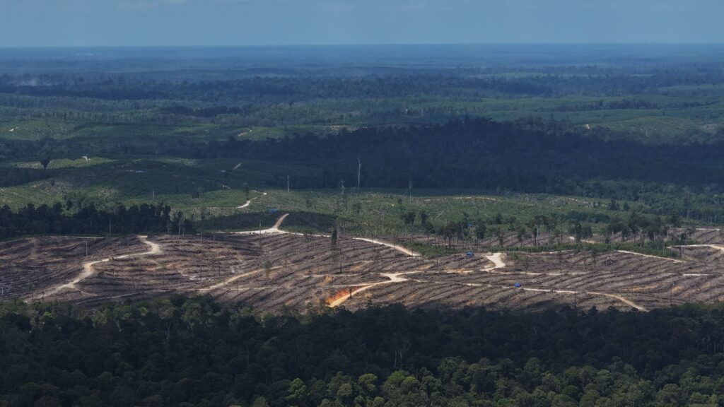 写真:RGEグループの供給業者 PT. SAKの事業管理地で、熱帯林が皆伐されたばかりの区域を記録したドローン写真。© Auriga Nusantara, 2025