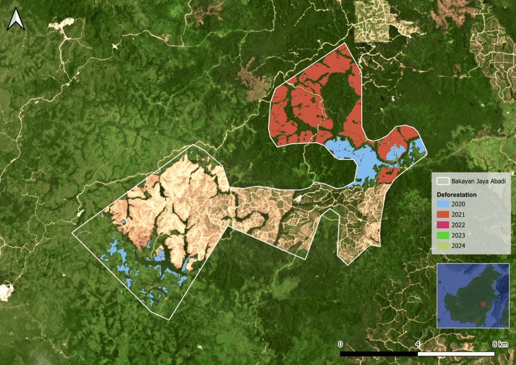 PT. BJAの事業管理地における年ごとの森林破壊を示した衛星画像(2020〜2024年)